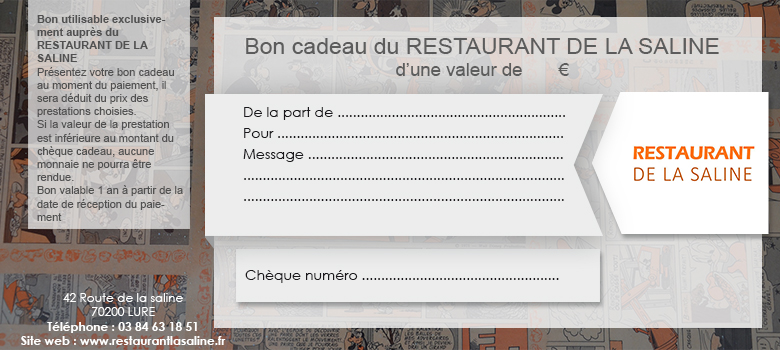 Vous recherchez une idée de cadeau original pour l’un de vos proches ? Pour toutes les occasions (anniversaire, fête, Noël, départ en retraite, etc.) les chèques cadeaux du Restaurant de la Saline à Lure (70) feront plaisir à coup sûr à vos amis ou à votre famille !